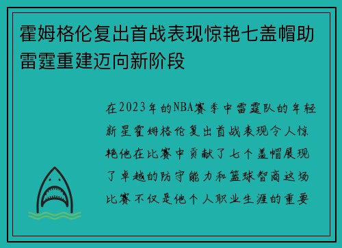 本文将探讨湖人队新任教练姚明如何带领球队重返辉煌之路。作为中国篮球的代表性人物,姚明在国际赛场上的成功经验和对篮球的深刻理解,使他成为湖人队的新任教练。文章将从四个方面进行详细阐述:首先,姚明的执教理念与风格;其次,如何增强球队的战术体系;第三,培养年轻球员的重要性;最后,加强团队凝聚力与文化建设。通过这些方面的分析,我们将看到姚明如何借助自身优势和丰富经验,引导湖人队重新崛起,追求更高的目标。 ...